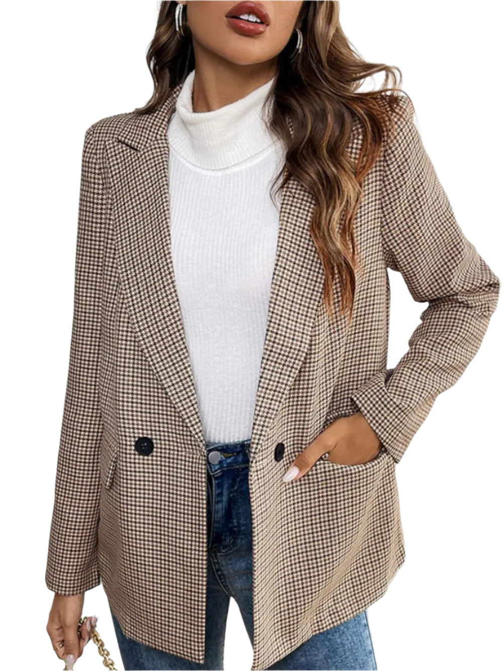 Women's Beige Brown Houndstooth Lapel Collar Long Sleeve Blazer