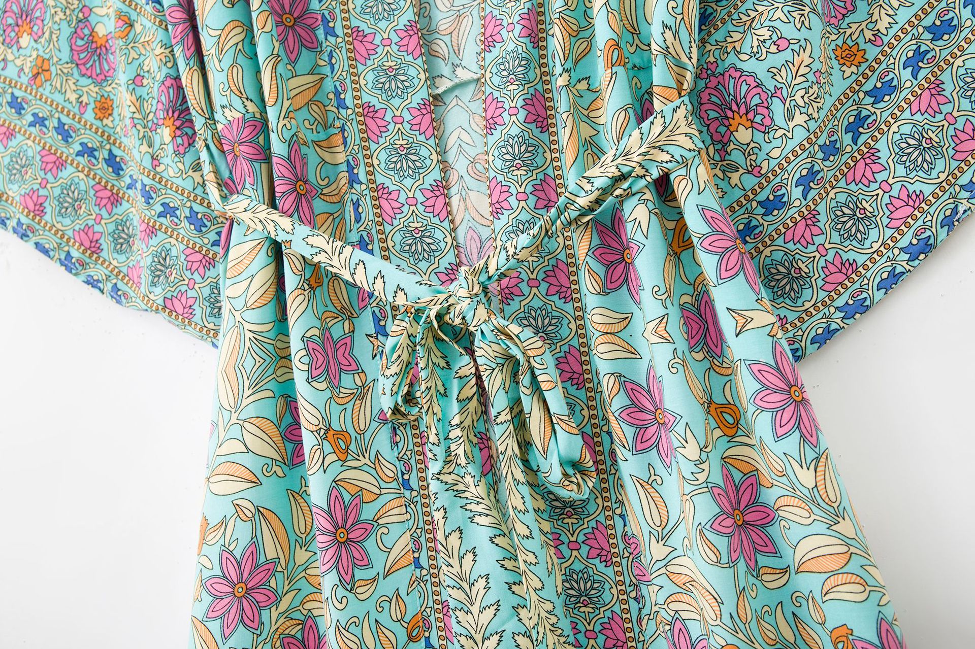 Embrace the Boho vibes in this funky Women's Turquoise and Pink Floral Kimono Robe!