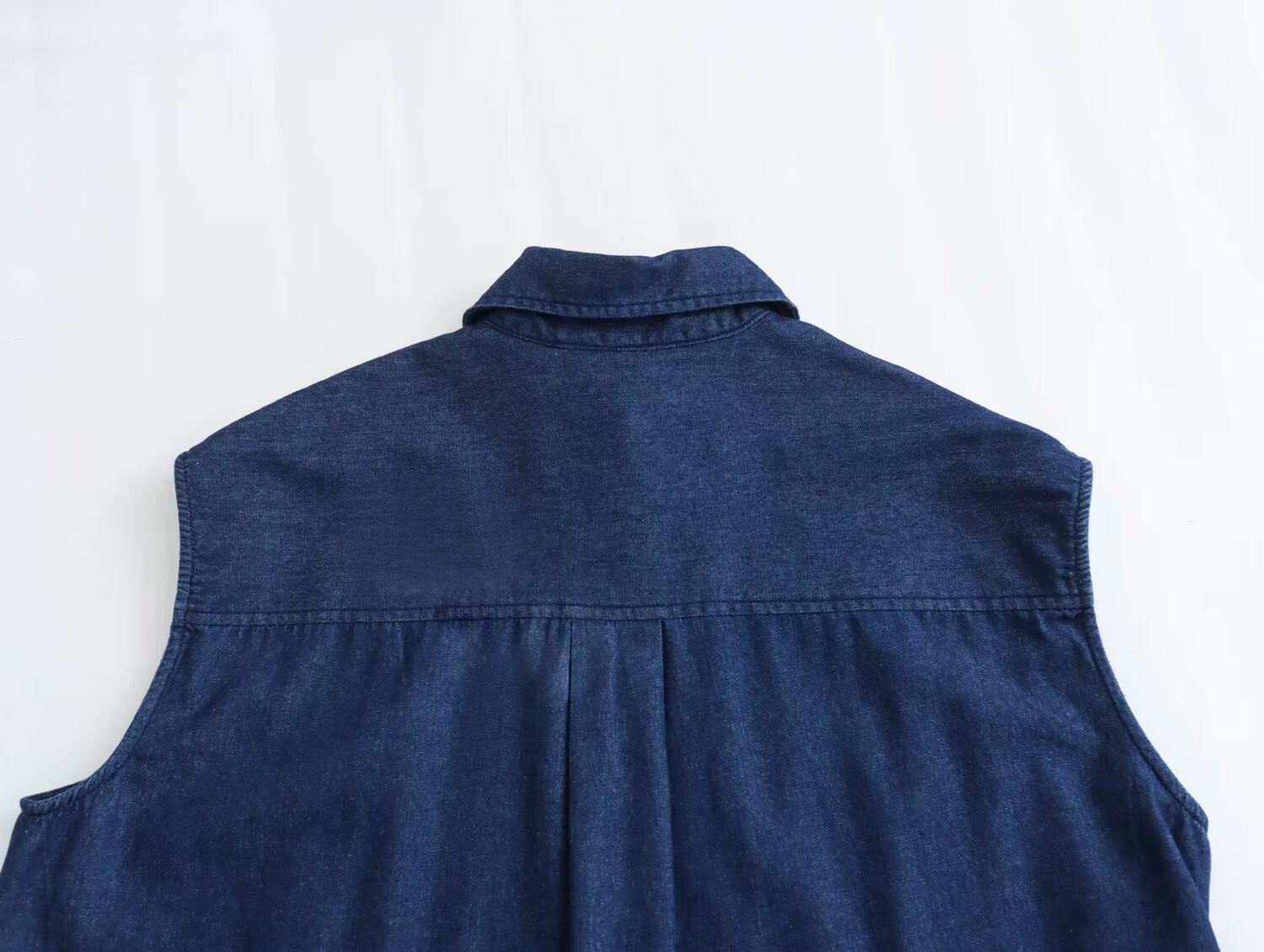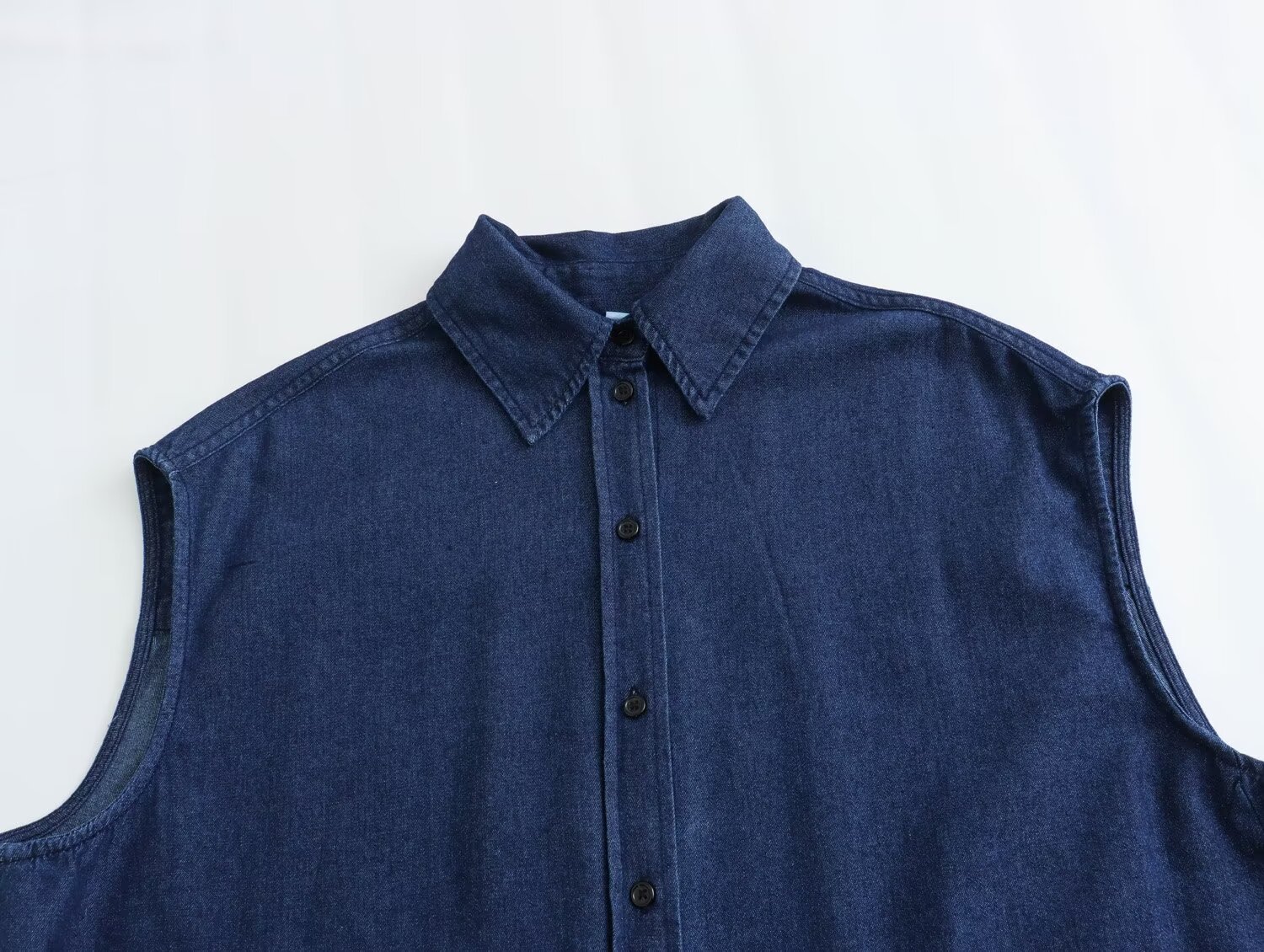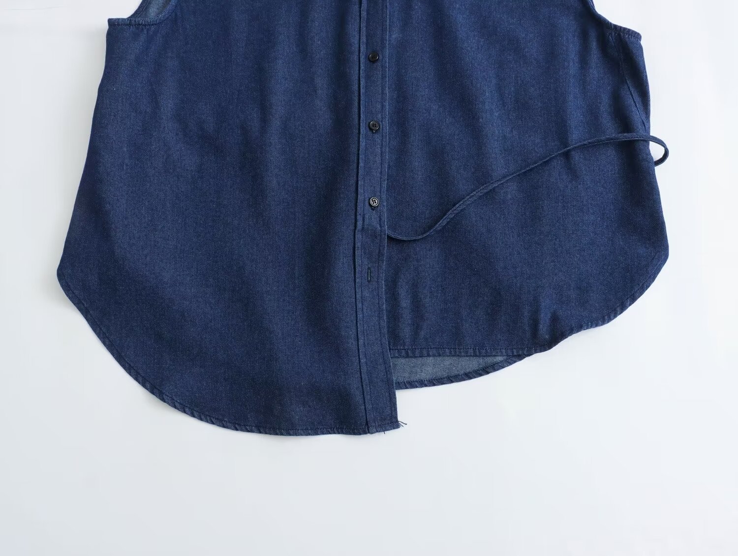 Designed with European and American influences, this top features a unique irregular button front and a playful side tie waist. The solid colour and sleeveless design add a sense of modernity, while the classic shirt collar and Cowboy fabric keep it timeless.