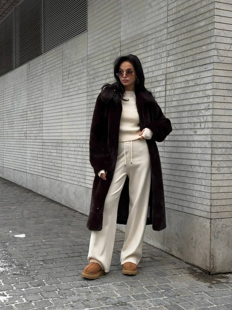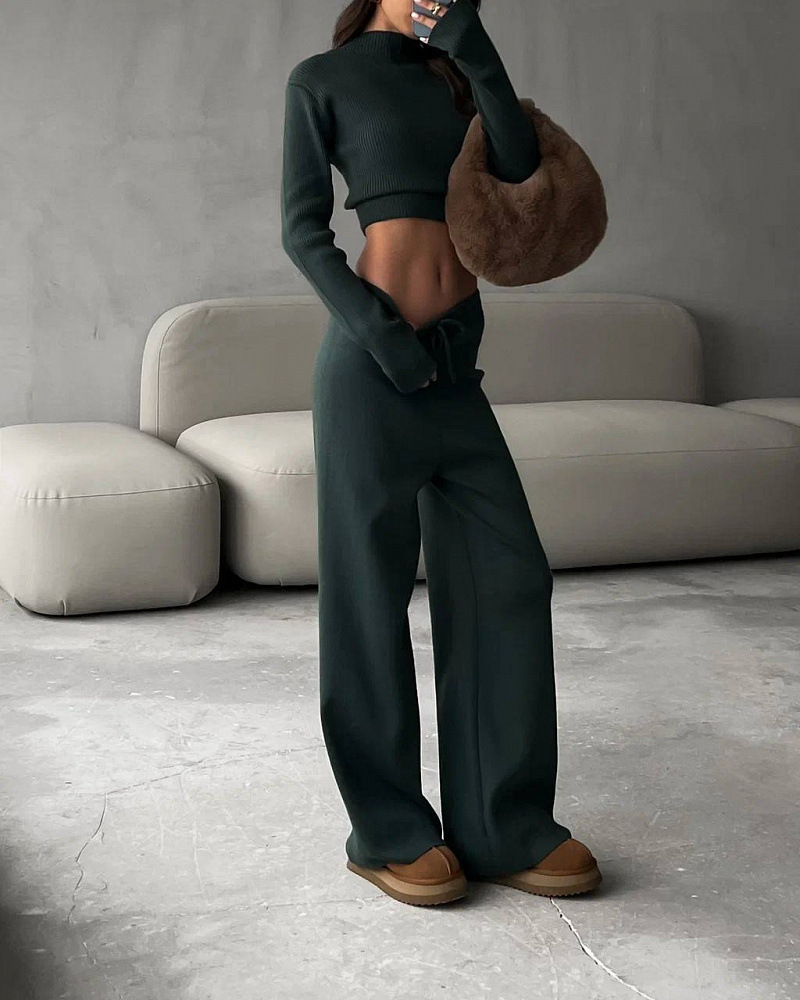 Women's Solid Colour Top and Trousers Two Piece Set Long Sleeved Short Crop Top Wide Leg Outfit