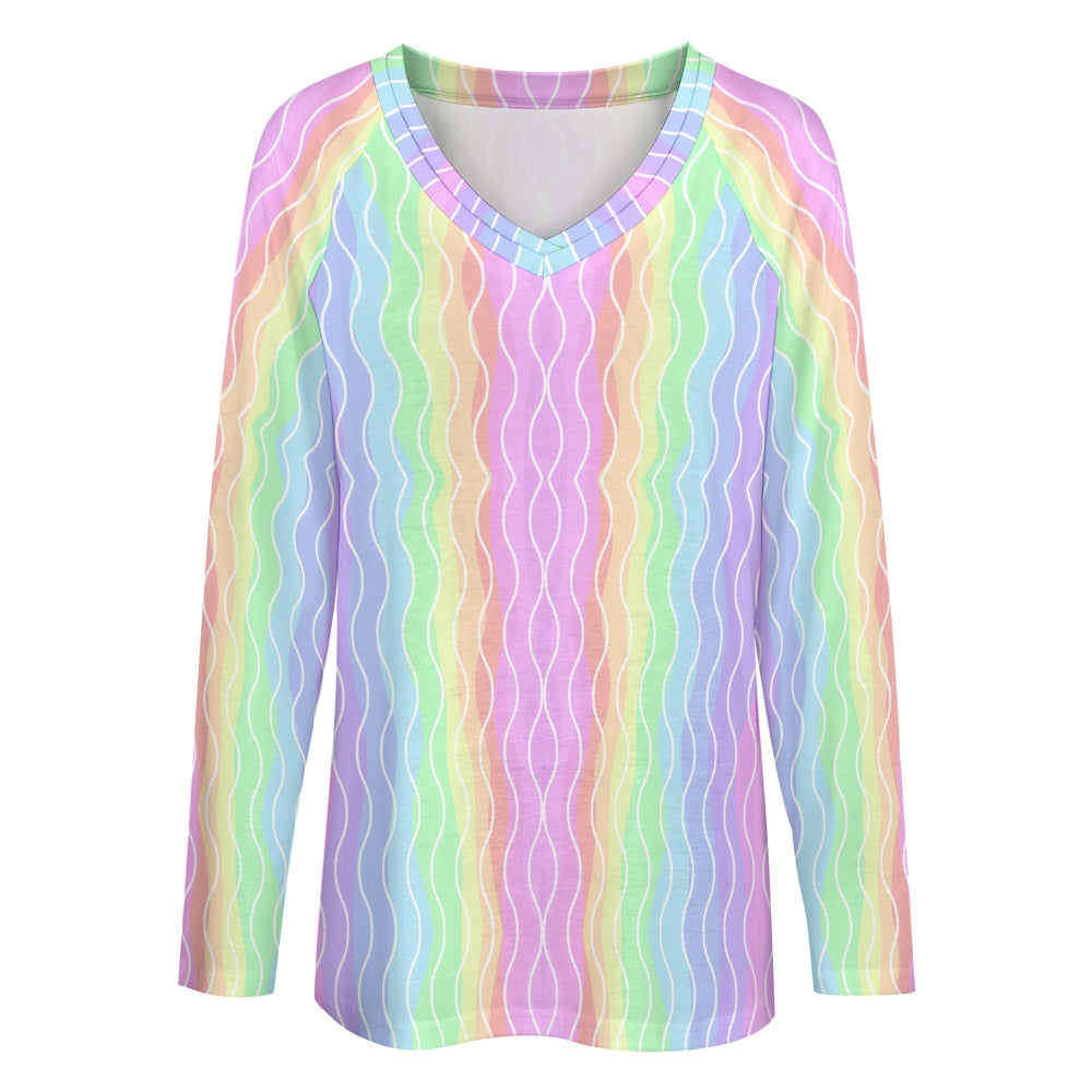 Women's Pastel Rainbow Print V-Neck Long Sleeve Loose T-shirt