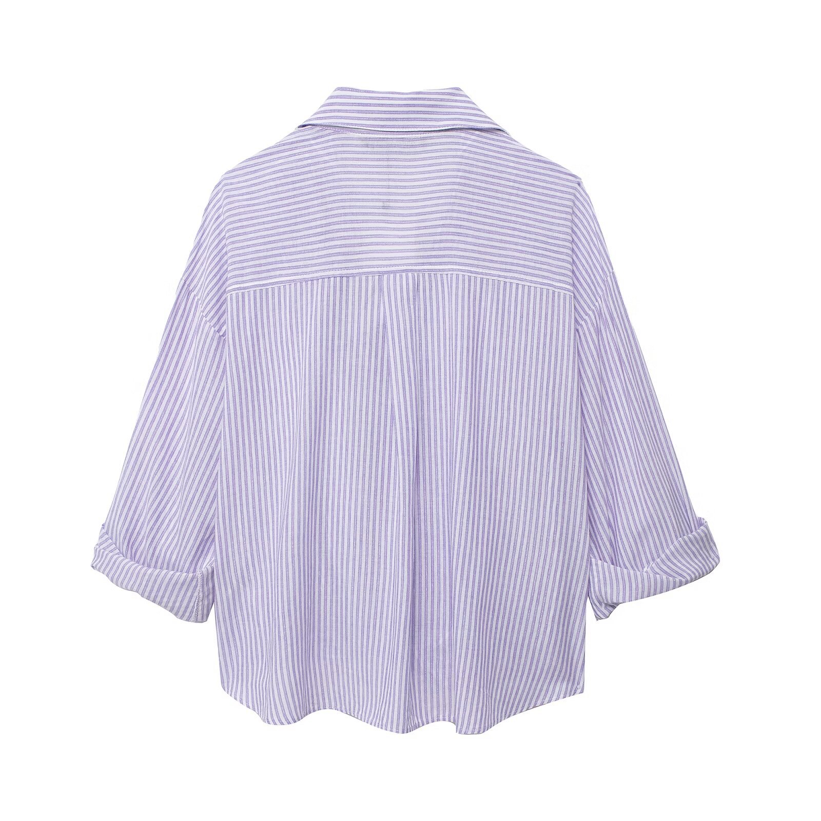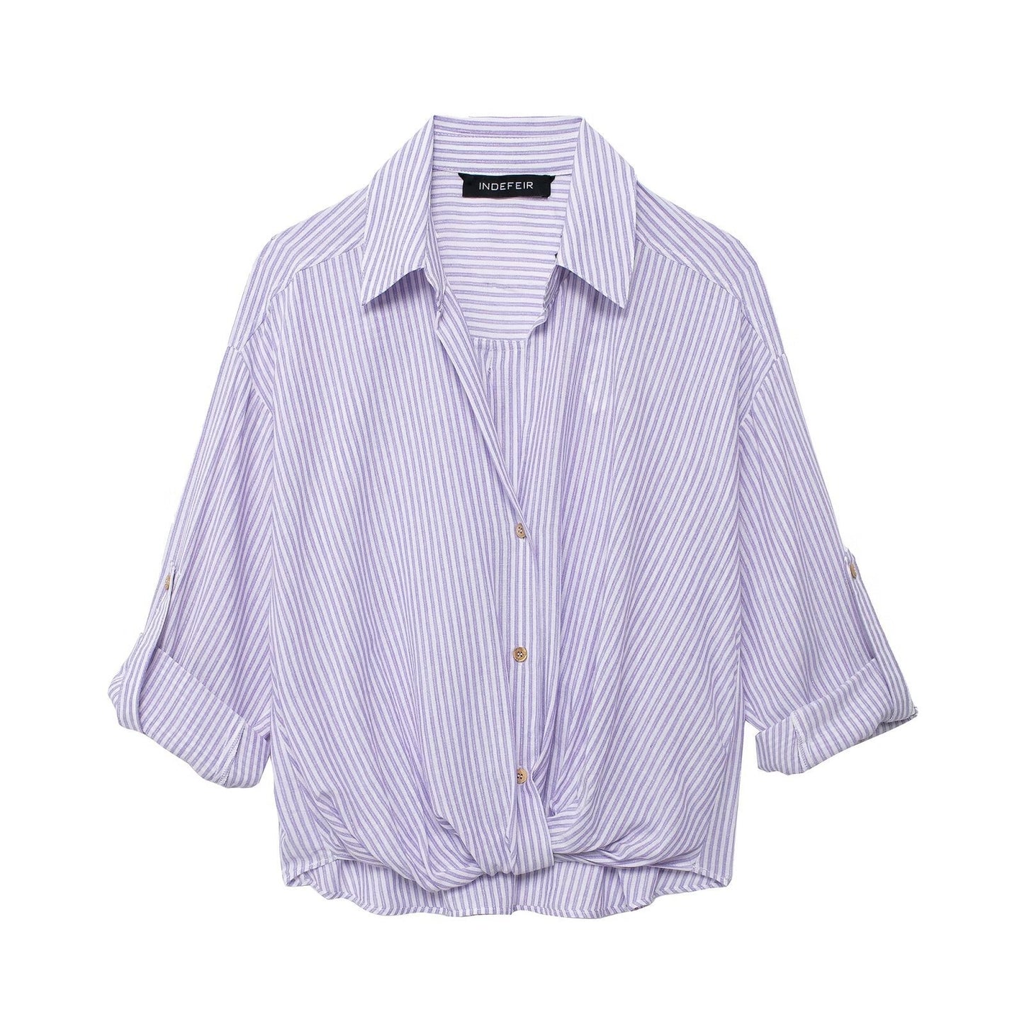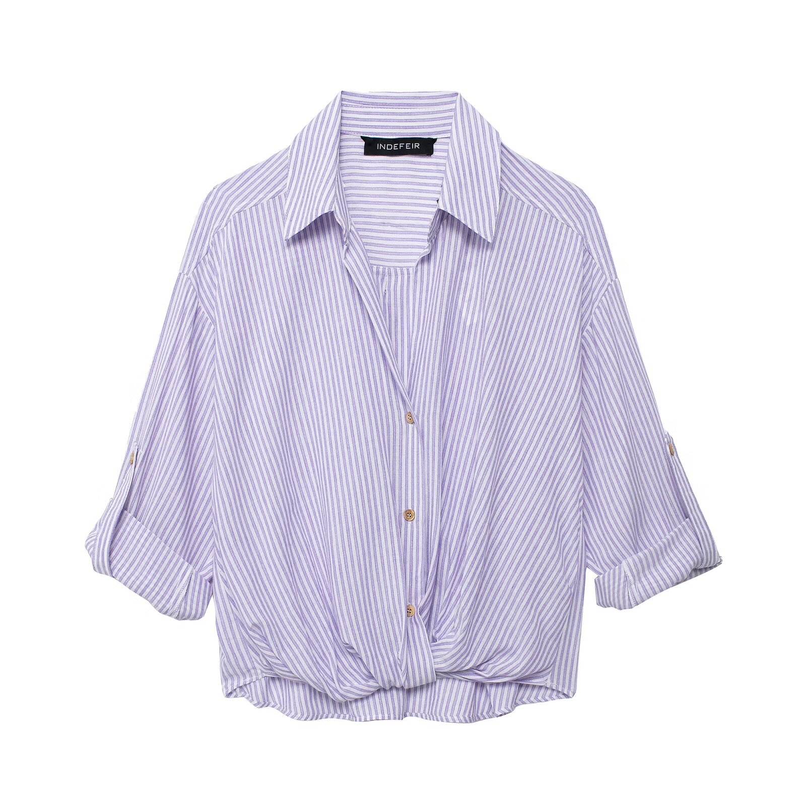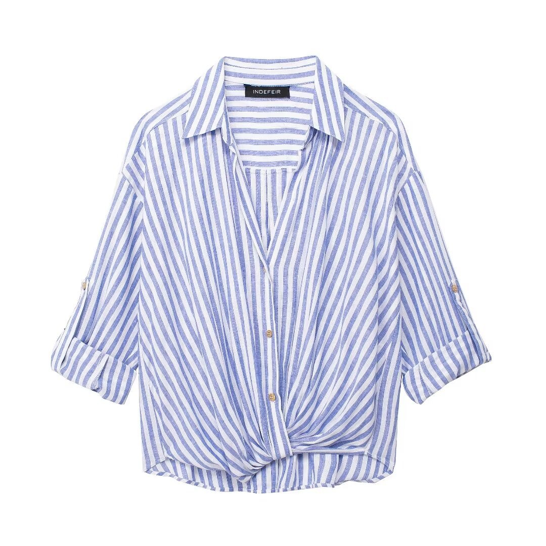 Unleash your inner fashionista with this must-have Women's Striped Knot Twist Front Shirt Blouse in a lightweight Linen Blend fabric.