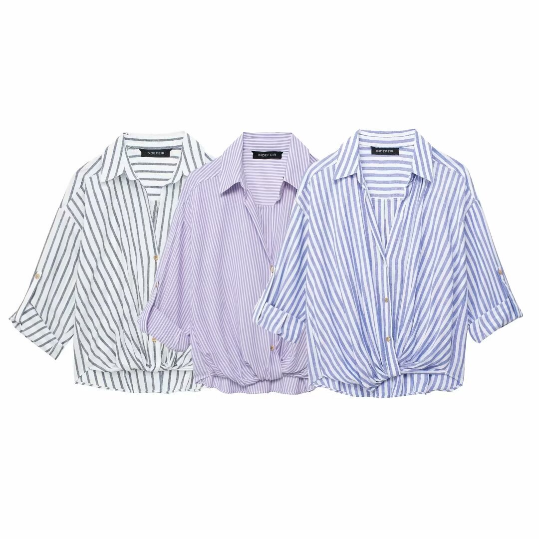 Women's Striped Knot Twist Front Shirt Linen V-Neck Blouse