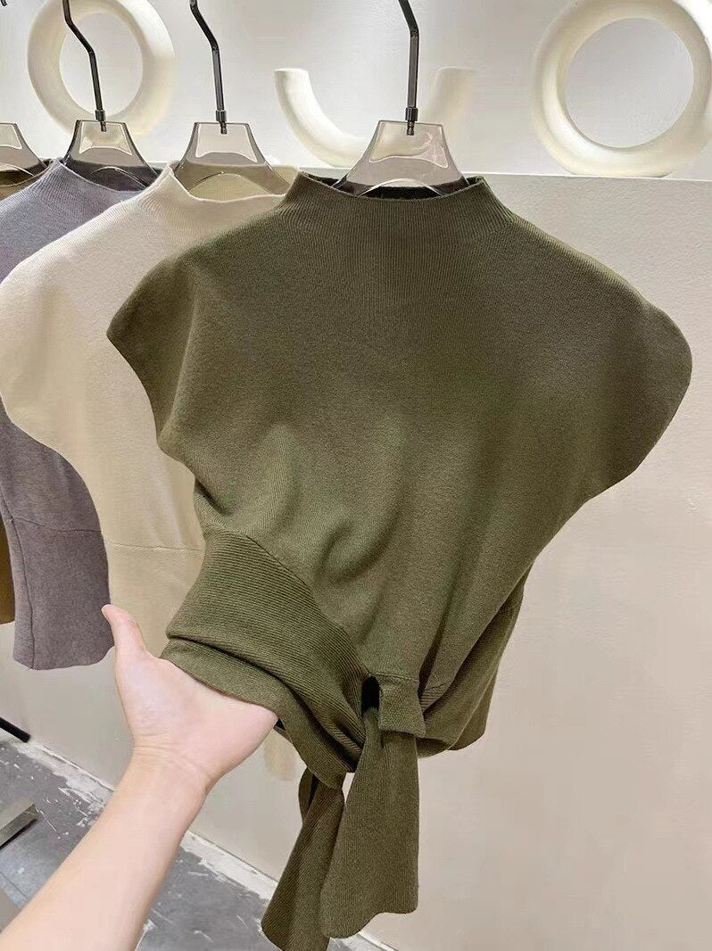 Women's Soft Knitted Tie Front Sleeveless T-Shirt Stand Collar Top