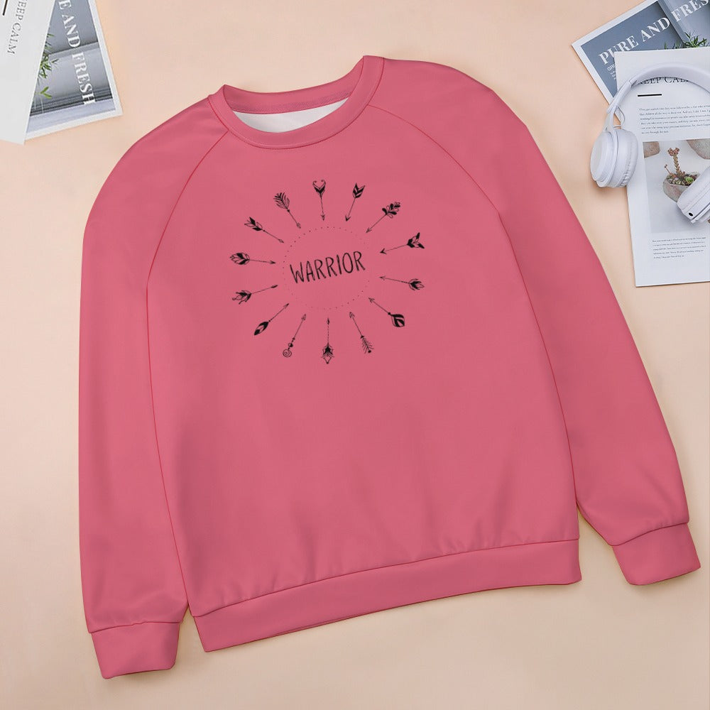 Embrace your inner strength with this stylish pink jumper featuring a bold 'Warrior' graphic surrounded by intricately designed arrows.